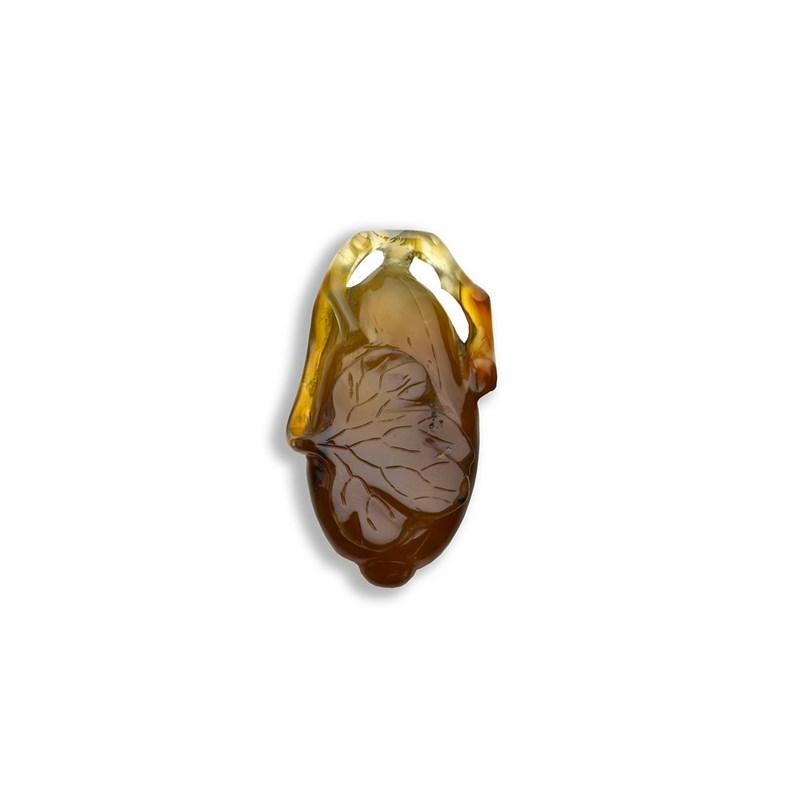 A Chinese agate pendant 18th/19th century, carved as a flattened gourd with a single leaf to one side and a scrolling tendril to the reverse, 5.7cm.
