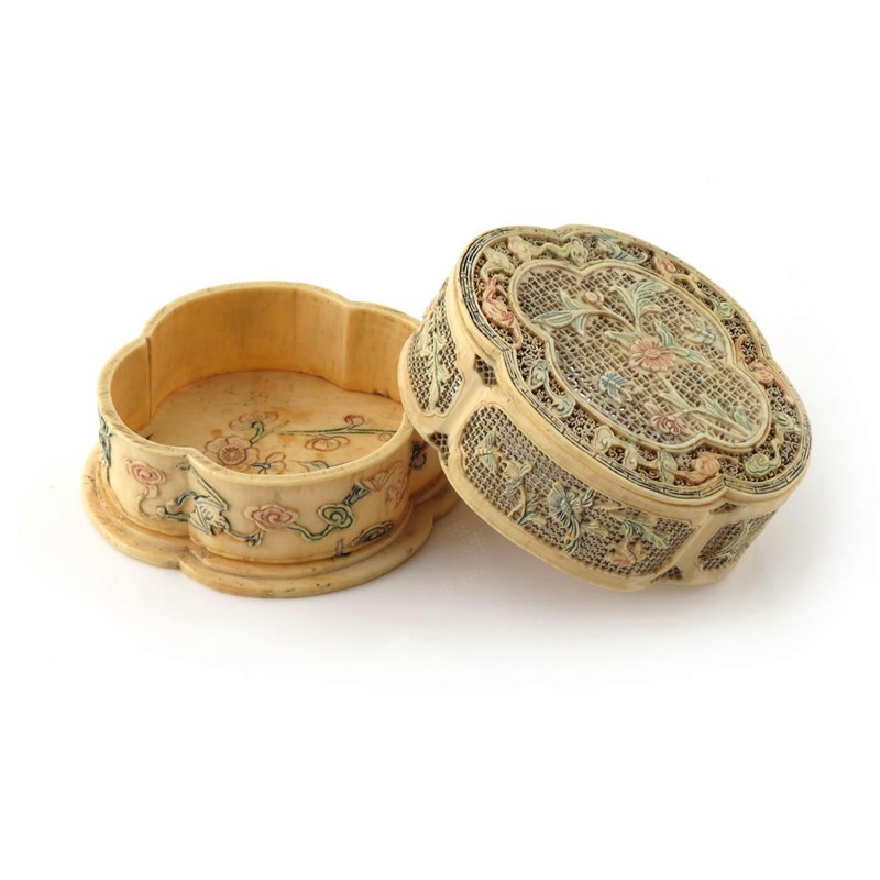 λ A Chinese polychrome ivory quatrefoil box and cover 18th century