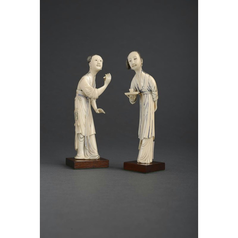 λ A pair of Chinese polychrome carved ivory models of ladies 18th century