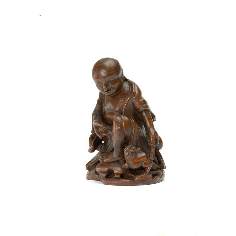 A Chinese bamboo carving of Liu Hai 17th/18th century, seated on a low rocky outcrop, a gourd and a whisk at his back, holding a string of cash in his right hand and gesturing to his three-legged toad which sits at his feet, 14cm.