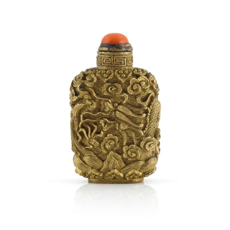 A rare Chinese gilt bronze snuff bottle 18th/19th century, cast in relief with a five-clawed dragon, a pagoda and a fish amongst cloud scrolls, with waves crashing on rockwork beneath, all within bands of ruyi and key fret, the base with a three character mark which reads shen de tang, 7.1cm.