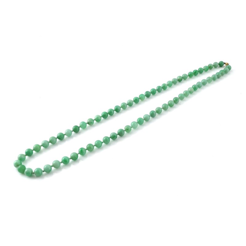 A Chinese jadeite bead necklace 20th century, the circular beads joined by a gilt metal clasp, 39.5cm.