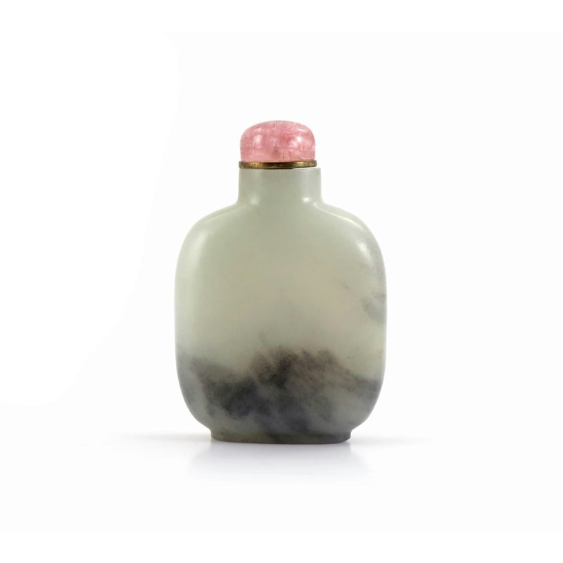 A Chinese pale celadon and grey jade snuff bottle 18th/19th century, the flattened rectangular body with rounded corners, raised on an oval ring foot, the stopper in pink tourmaline, the stone with variations to simulate a distant mountain range, 8cm.