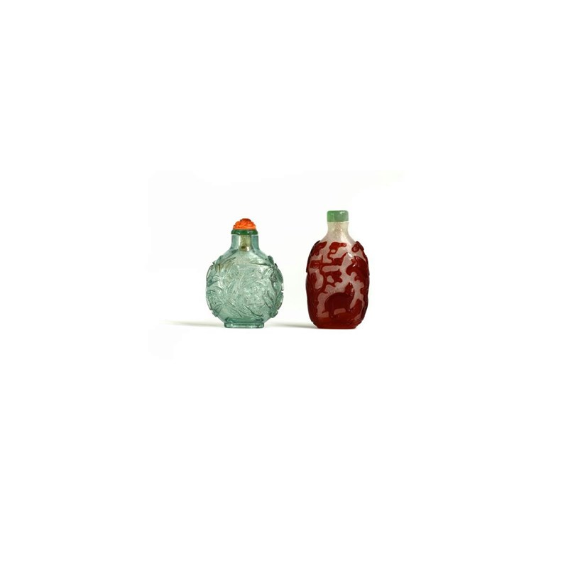 λ Two Chinese glass snuff bottles 1780-1850, one in aquamarine, carved in relief with orchid, the other in overlaid red glass, carved with three beasts and a bird of prey, perched on rockwork and pine, reserved on a snowflake ground, 8cm. (2)