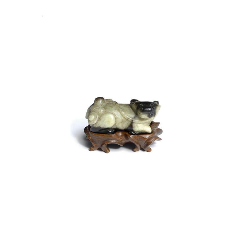 A Chinese celadon and black jade carving of a recumbent water buffalo Ming dynasty, with his head turned to dexter, and with a boy clambering upon his back, holding a tether in his left hand, together with a hardwood stand, 7.5cm. (2)