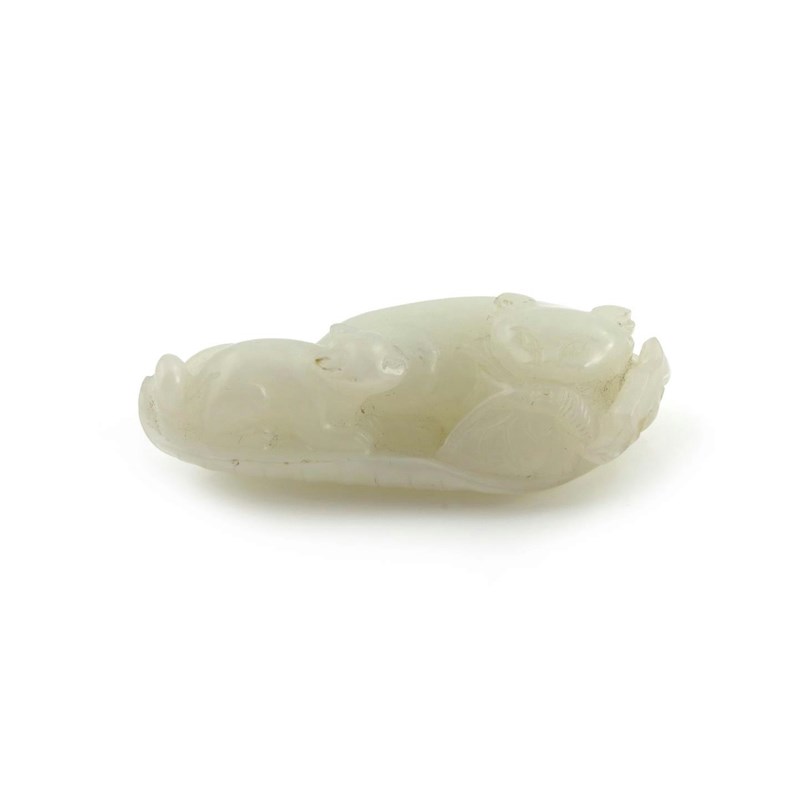 A Chinese white jade carving of a cat and her kitten 19th century, both resting together on a large artemesia leaf, the larger animal with a butterfly caught in her jaws, 6.8cm.