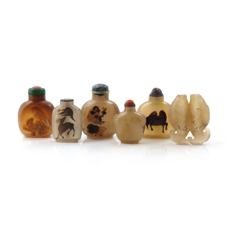 λ Six Chinese agate snuff bottles 19th century, one carved as twin fish, the others of ovoid form, each carved in relief variously with a deer and a crane, a horse and monkey, a bear and bird and figures, the last plain with ruyi-shaped handles, 8cm max. (6)