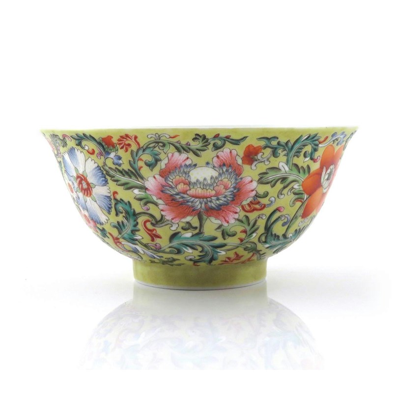 A Chinese yellow ground bowl six character Daoguang mark but probably later, the exterior painted with colourful flowers and leaves, the interior with five bats, 11.4cm.