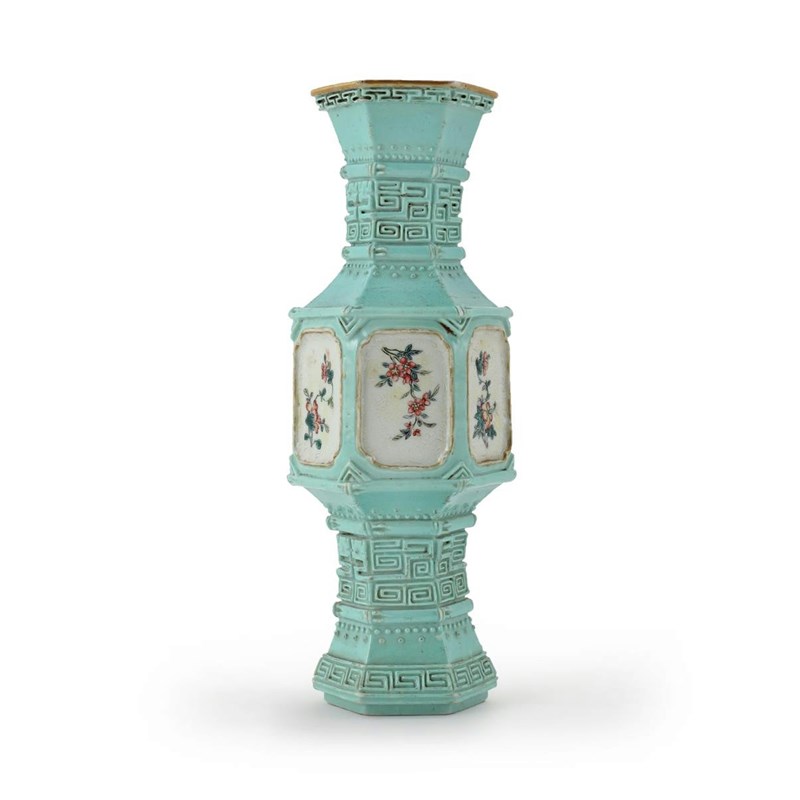 A small Chinese hexagonal turquoise vase six character Qianlong mark and late in the period, decorated with a rectangular panel to each face containing flower sprays on a white scrolling ground within bamboo borders, with bands of studs, key fret and stylized dragons, 16.5cm.