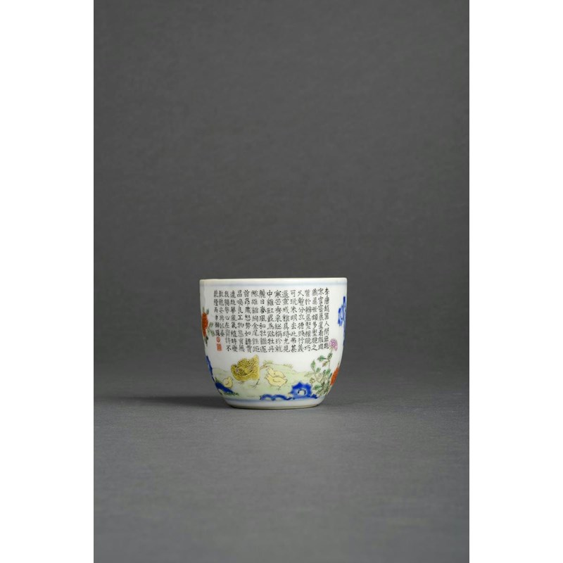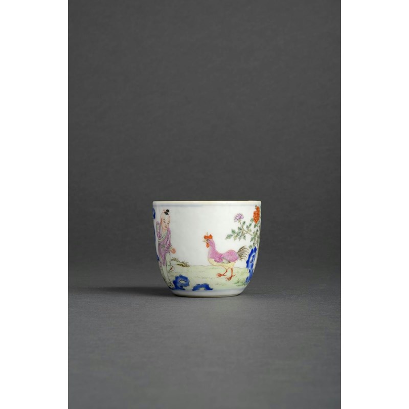 A Chinese famille rose chicken bowl Republic period, finely painted to the exterior with a young boy and a cockerel with blue rockwork and peony, the reverse with a hen and her chicks below a poetic inscription, six character Qianlong seal mark, 8.1cm dia.