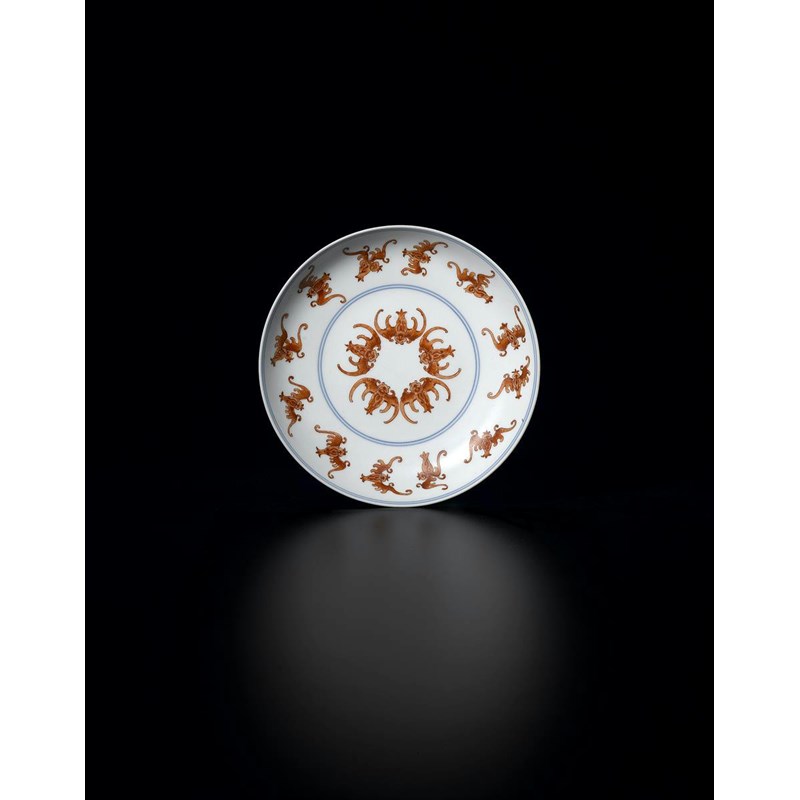 A Chinese underglaze blue and iron-red decorated bats dish six character Yongzheng mark and of the period 1723-35, painted to the well with five bats with wings outstretched to form a circle, the rim with a further twelve bats in flight, all between concentric double bands, the reverse with eight bats, a band of key fret to the foot, contained in a fitted box, 15cm. (2)