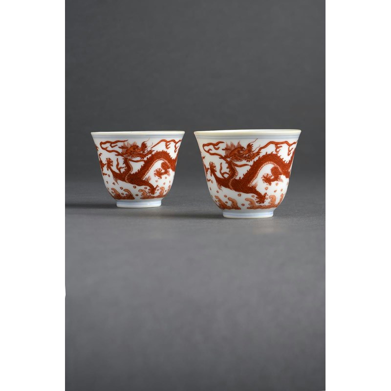 A pair of Chinese Imperial iron-red dragon wine cups six character Daoguang marks and of the period 1821-1850, each painted with two scaly five-clawed dragons above crashing waves, 6.1cm. (2)
