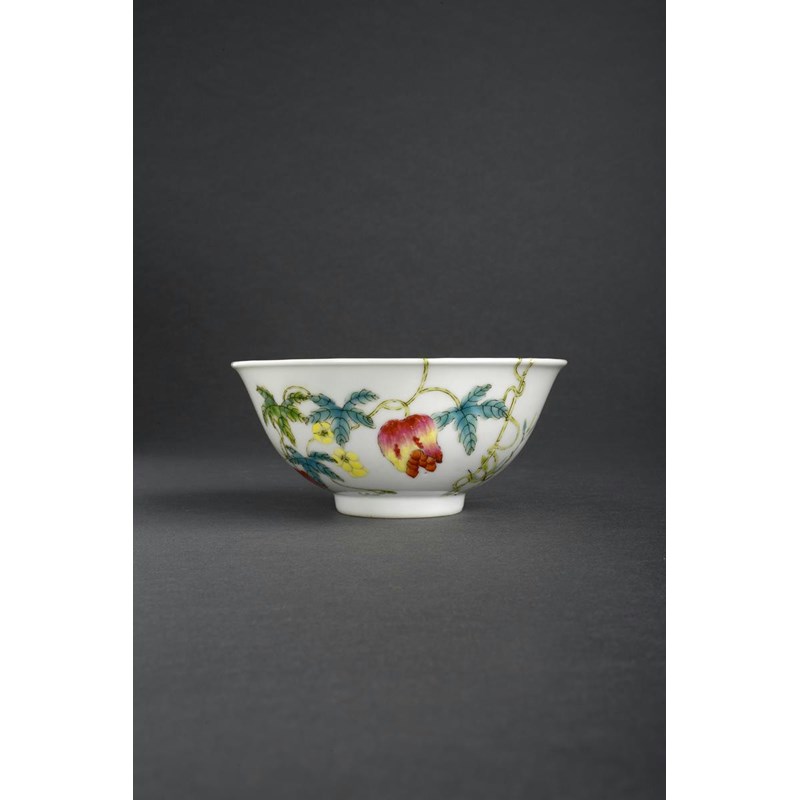 A Chinese famille rose bamboo and fruit bowl six character Guangxu mark in iron-red and of the period 1875-1908, painted with a fruiting and flowering bitter melon vine, leafy bamboo stems, and two butterflies, 11.5cm.