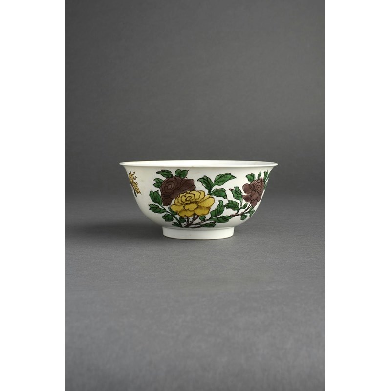 A Chinese famille verte bowl six character Kangxi mark and of the period 1662-1722, painted to the exterior with flowering peony and prunus sprays, with two butterflies in flight, reserved on a white ground, 15cm.