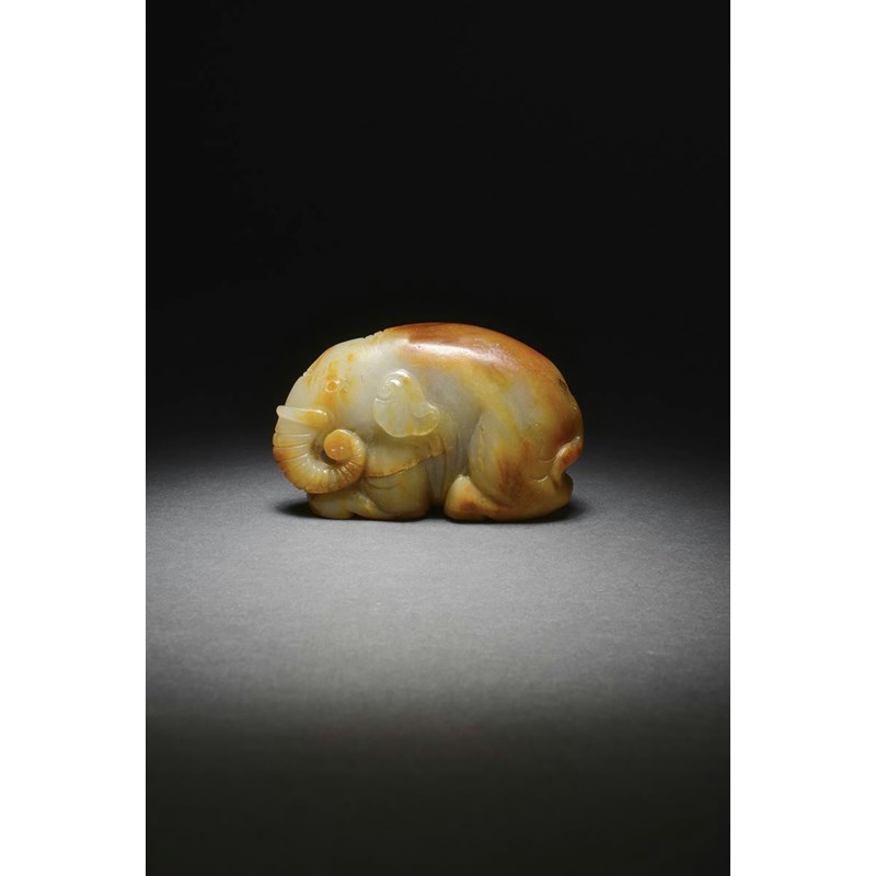 A Chinese russet-celadon pebble jade carving of an elephant probably late Qing dynasty, recumbent, resting on its front legs, its head slightly raised and its trunk curled to the left, 7.5cm.
