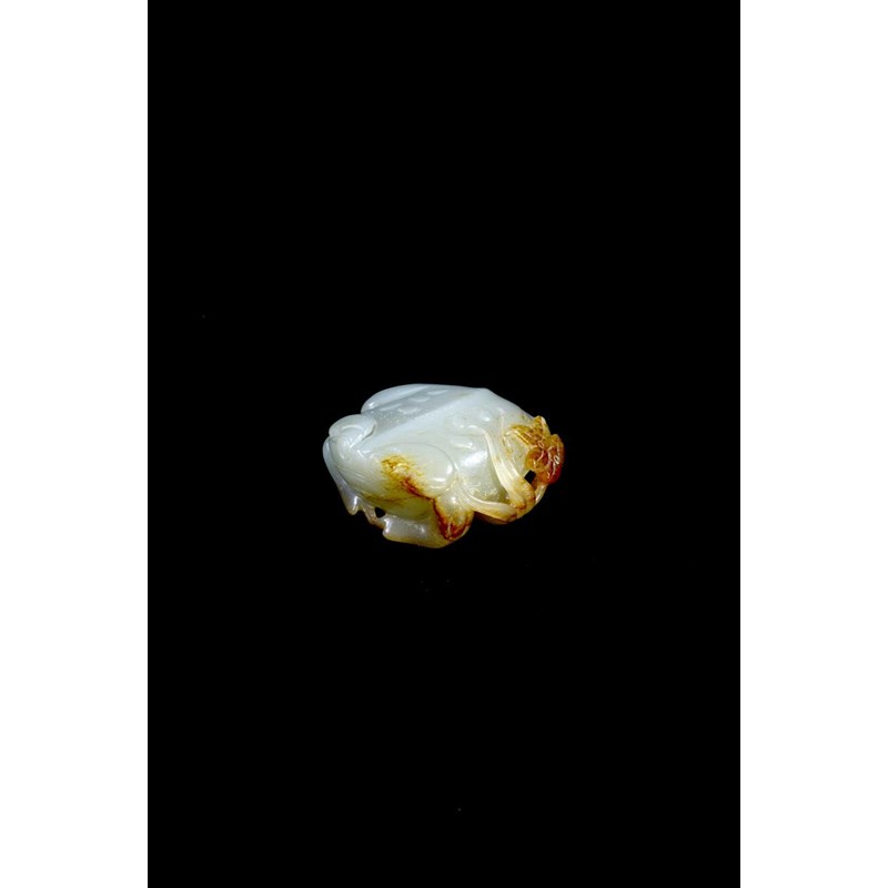 A rare Chinese pale celadon jade carving of a toad 17th/18th century, the amphibian crouching with a curved spine and spotted back, a flowering leafy tendril beside him, his webbed feet tucked neatly beneath his body, the stone with russet markings, 5cm.