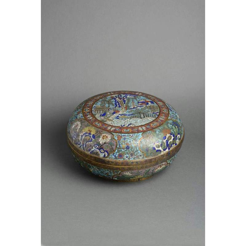 A massive Chinese cloisonné circular box and cover 19th century, the domed cover with a central panel containing a mountainous landscape and a waterfall, with pagodas and a small bridge crossing the river, encircled by a lotus scrolling band and a wider band of quatrefoil panels with peony, chrysanthemum, lotus and prunus, the rims decorated with key fret, the base similarly decorated, the interior with circular foliate panels within an irregular geometric ground, 43cm. (2)