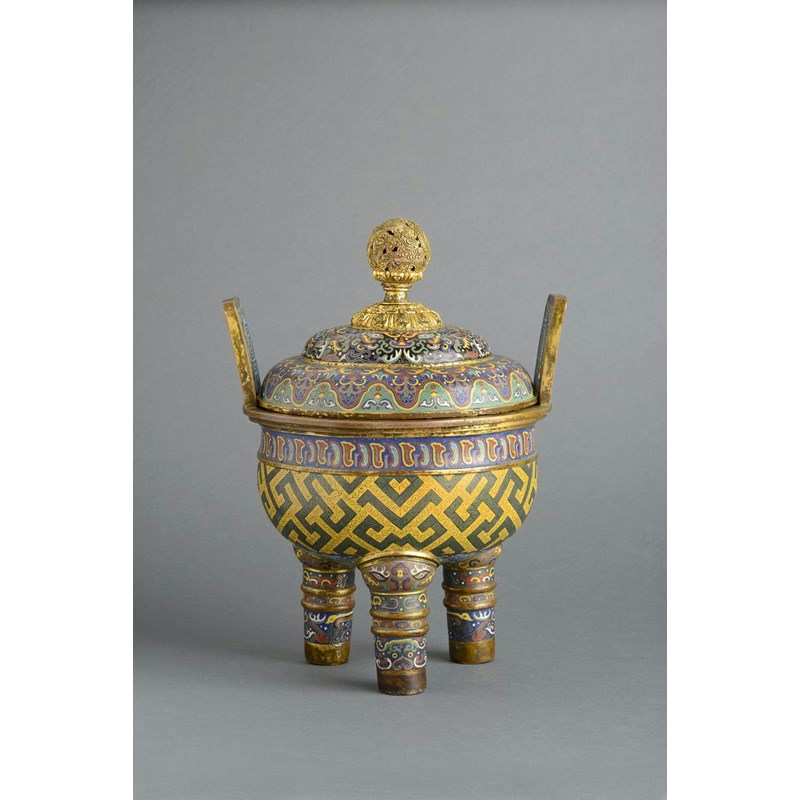 晚清(可能) 銅胎掐絲琺瑯回紋三足蓋鼎