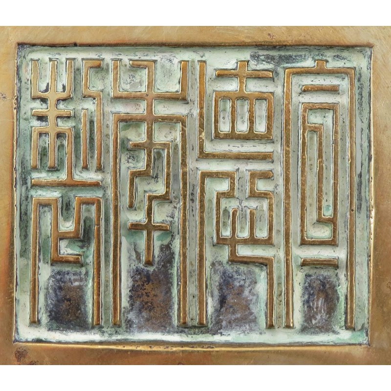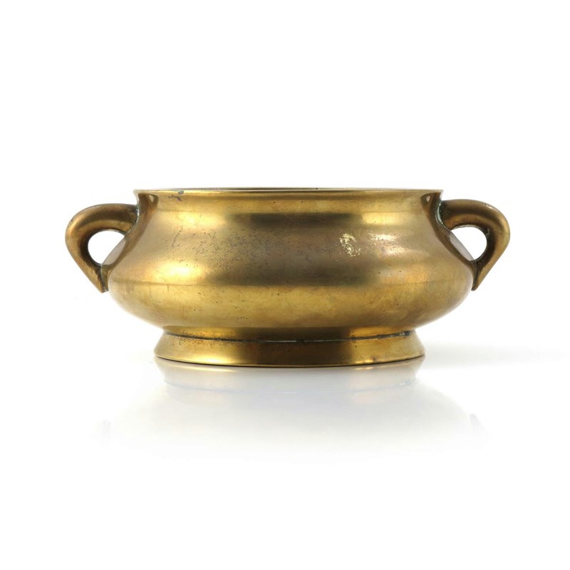 A Chinese gilt bronze incense burner 18th/19th century, the compressed circular body with loop ring handles and raised on a flared foot, the base with a Xuande mark, 23cm.