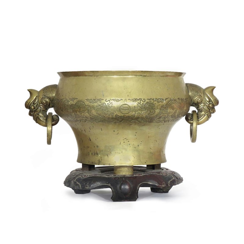 A massive Chinese bronze incense burner 19th century, the circular body with heavily-cast mask head and loose-ringed handles and engraved with a wide band of scaly dragons and phoenix contesting flaming pearls of wisdom, raised on three feet, together with a carved hardwood stand, 65cm. (2)