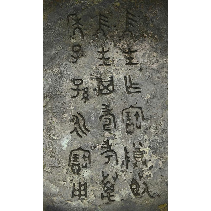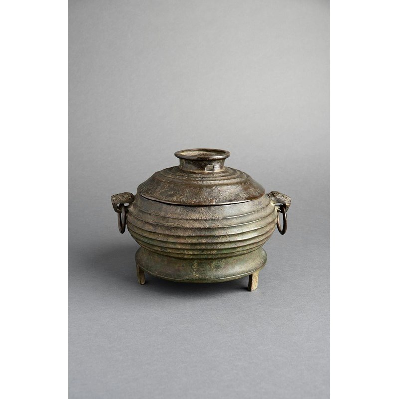 A Chinese bronze wine vessel and cover, gui late Western Zhou dynasty (c.1100-771 BC), the ovoid body with concave ridges and with loose animal mask handles to the shoulder, raised on a flared foot supported by three feet, the domed cover with a large circular finial, an inscription to the underside which is mirrored in the base's interior which reads wei sheng zuo bao zun gui, wei sheng qi shou kao wan, nian zi sun yong bao yong (the ruler had this precious wine vessel made. May his sons and grandsons make eternal and precious use of it for a thousand years), 29.5cm. (2)
