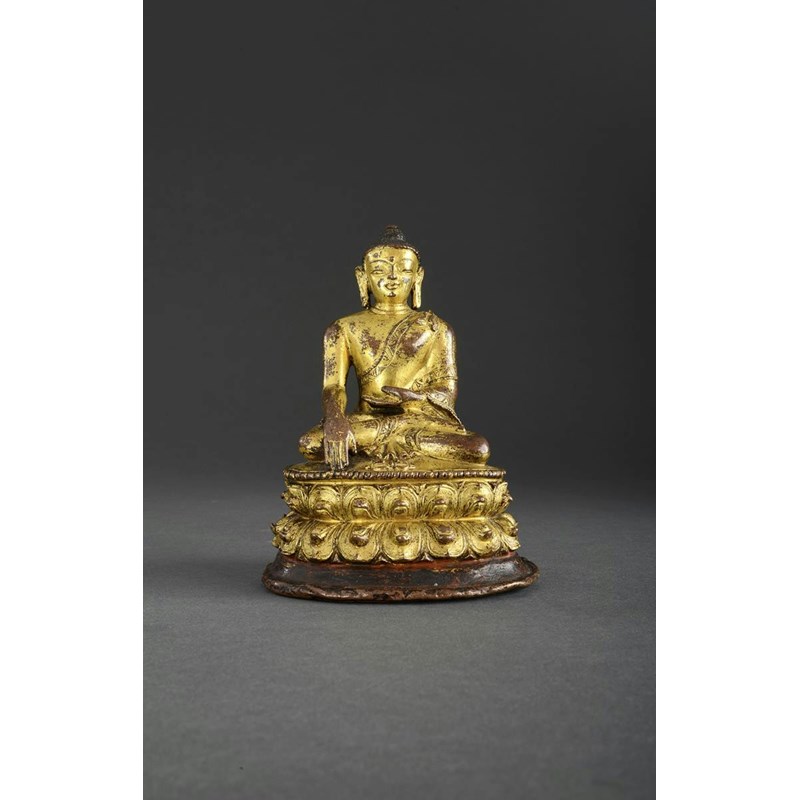 A Nepalese gilt bronze figure of Shakyamuni Buddha 13th/14th century, seated on a double-lotus base, with the vajra resting before him, his hair secured in a high chignon, his face with a serene expression and elongated ears, 13cm.