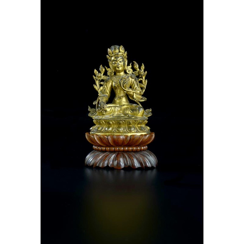 A Tibeto-Chinese gilt bronze figure of White Tara 17th/18th century, depicted on a double lotus base in dhyanasana, her left hand in vitarkamudra, her right in varadamudra, the palms and soles incised with eyes, her face with a central third eye and a serene expression, her hair secured in a high chignon and with an elaborate headdress, with lotus sprays and ribbons at her shoulders, a hardwood fitted stand, 10.3cm. (2)