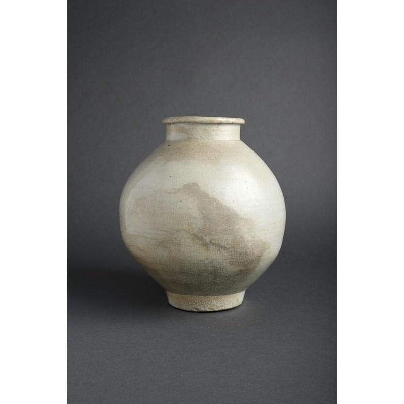 A large Korean porcelain moon jar Choson dynasty 18th/19th century, the ovoid body raised on a slightly tapering circular foot, the cylindrical neck with a rolled rim above a band of incised chevrons, the glaze with irregular grey and cream markings, 34cm.