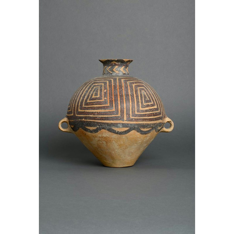 A large Chinese Neolithic vase c.2000 BC, the ovoid body tapering to the footrim and with lug handles, painted in red and black pigments with a geometric spiral design above waves, the cylindrical neck with chevrons, 34.5cm.