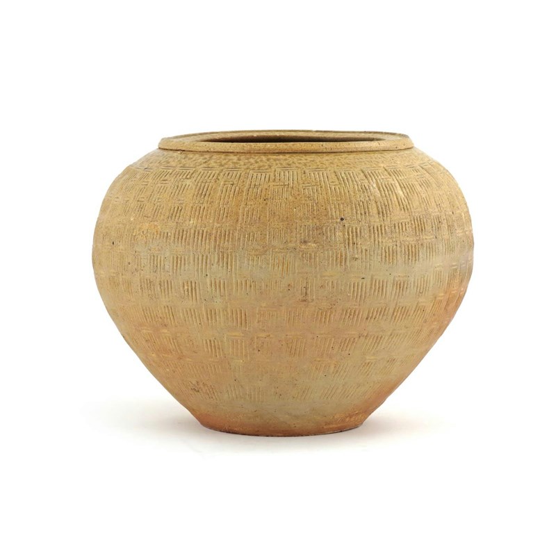 A large Chinese pottery ovoid vase Warring States period 475-221 BC, the rounded body with a flat moulded rim, the exterior decorated with a continuous spiral of geometric motifs rising from the base, decorated with a sandy-yellow glaze, 36cm dia.