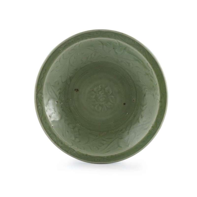 A Chinese Longquan celadon dish early Ming dynasty, the flaring body rising to a flattened rim, carved to the interior with a wide band containing scrolling foliage, the well with a single peony flower within concentric bands, the reverse with petals radiating from the circular footrim, 31.3cm.