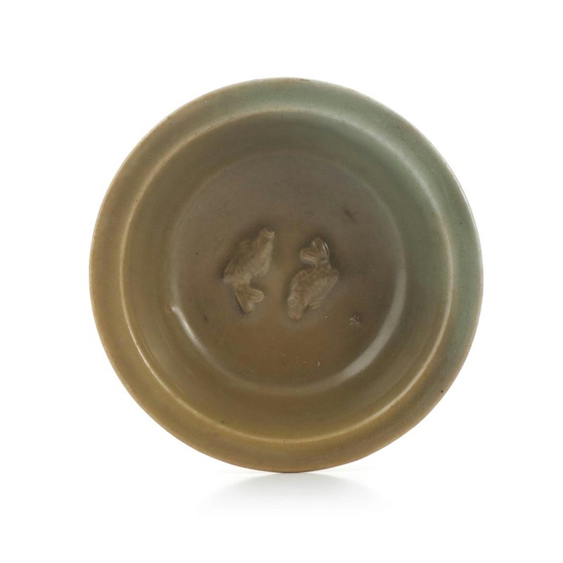 A small Chinese Longquan celadon marriage bowl Song dynasty 960-1279 AD, moulded with two scaly fish to the well, the flared body rising to a flattened rim, the reverse with lobes radiating from the foot, 13.3cm.