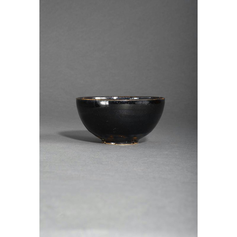 A Chinese black glazed bowl Song dynasty 960-1279 AD, the ovoid body raised on a short circular footrim, decorated with a rich black glaze stopping just short of the foot to reveal the grey stoneware, 11.5cm.