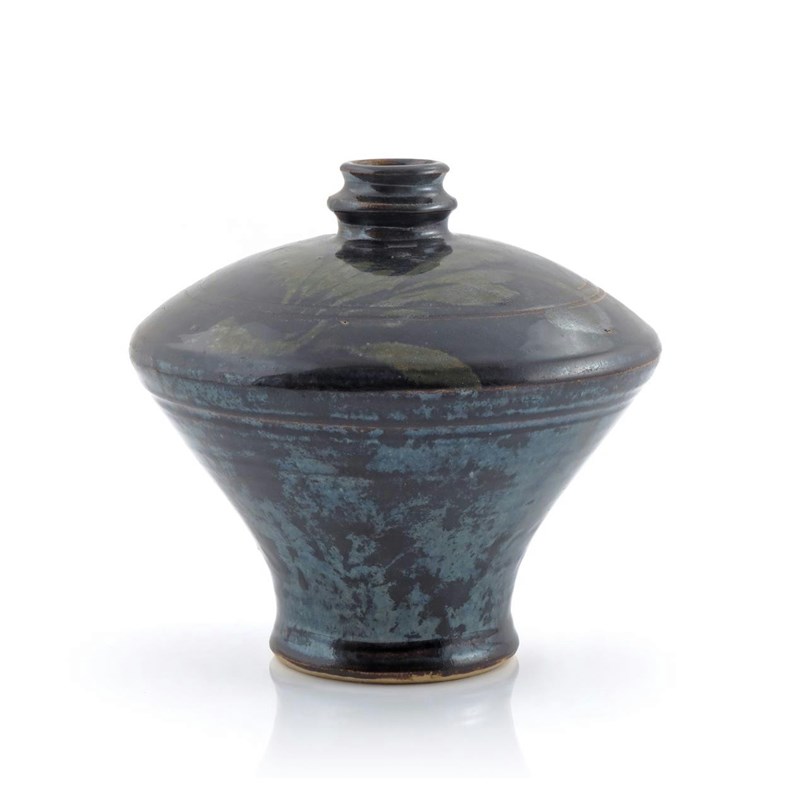 A Chinese black glazed vase Jin dynasty 1115-1234 AD, the body widely flaring from the splayed foot, the domed shoulder incised with concentric bands, meeting a narrow knopped neck, decorated with an unctuous blue-black glaze, a freely drawn foliate design in ochre-yellow, 21.5cm high.