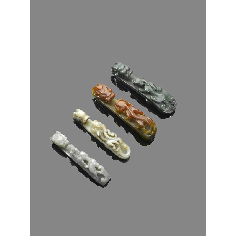 Four large jade and hardstone belthooks 19th century, all carved with dragon's head terminals, a confronting smaller chilong upon the shaft, 12.5cm. (4)