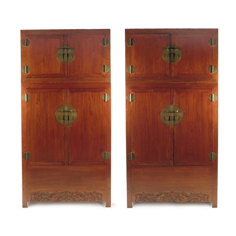 A pair of Chinese hardwood and brass-mounted four-door wardrobes Qing dynasty, each constructed in two sections, with single tenon joints, the upper sections with doors enclosing a single shelf, the lower bodies with large doors, each enclosing two drawers, the aprons carved in relief with stylized scrolls and foliage, 250cm x 126cm x 53cm. (4)