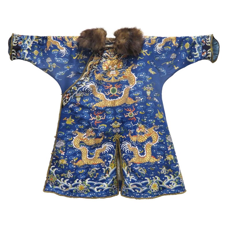 A small Chinese Winter dragon robe late Qing, fur-lined and with a fur collar, decorated with eight dragons, cloud scrolls, bats, vases and other auspicious things, all reserved on a blue ground, 134cm across.
