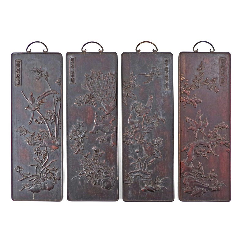 A set of four Chinese hardwood panels late Qing dynasty/Republic period, each depicting pairs of birds with rockwork and trees, one with birds of paradise, another cranes, another peacocks, the fourth a cockerel and hen, each with an inscription, 48.5cm x 16.5cm. (4)