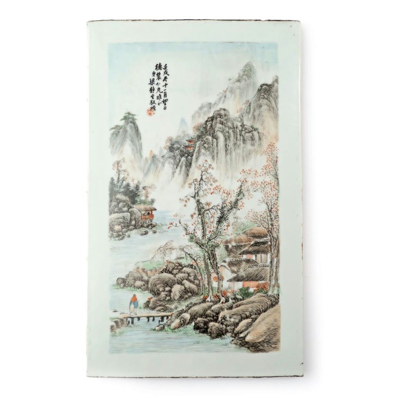 A rare Chinese porcelain rectangular panel by Wang Ye Ting dated 1922 depicting a lone figure on a bridge in a mountainous landscape, crossing towards a small village, and with an inscription which reads ren wu dong ten yi yue wang ri de nong ren xiong ya zheng di Liang Jing Sheng zeng (given as a gift by Liang Jing Sheng to his brother), together with a red seal mark, the artist's signature to the reverse, 43.2cm x 26cm.
