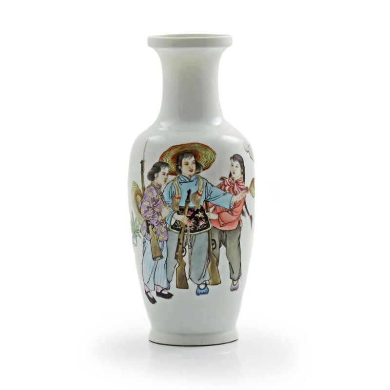 A Chinese famille rose vase Republic period, depicting female soldiers from the Second Sino-Japanese War (1937-1945), conversing and carrying weapons, the base with a mark which reads Jing De Zhen zhi, 29.2cm.
