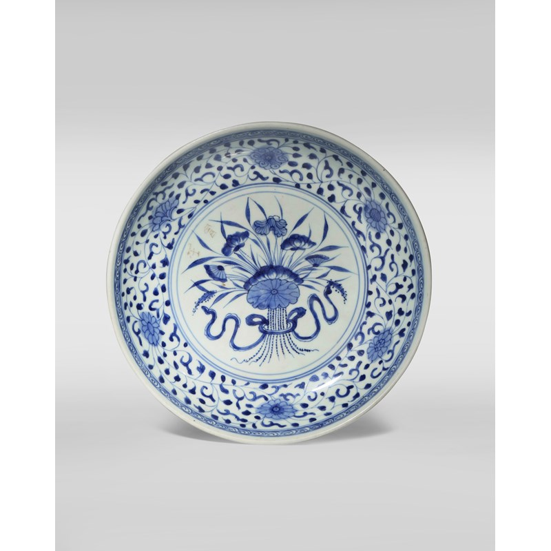 A CHINESE BLUE AND WHITE 'LOTUS' DISH 18TH/EARLY 19TH CENTURY Painted with blossoms and scrolling...