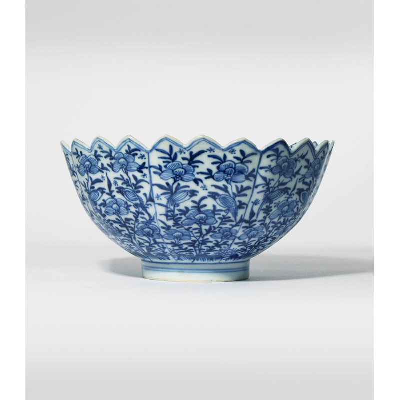 A CHINESE BLUE AND WHITE MOULDED 'CAMELLIA' BOWL KANGXI 1662-1722 Shaped as a flowerhead