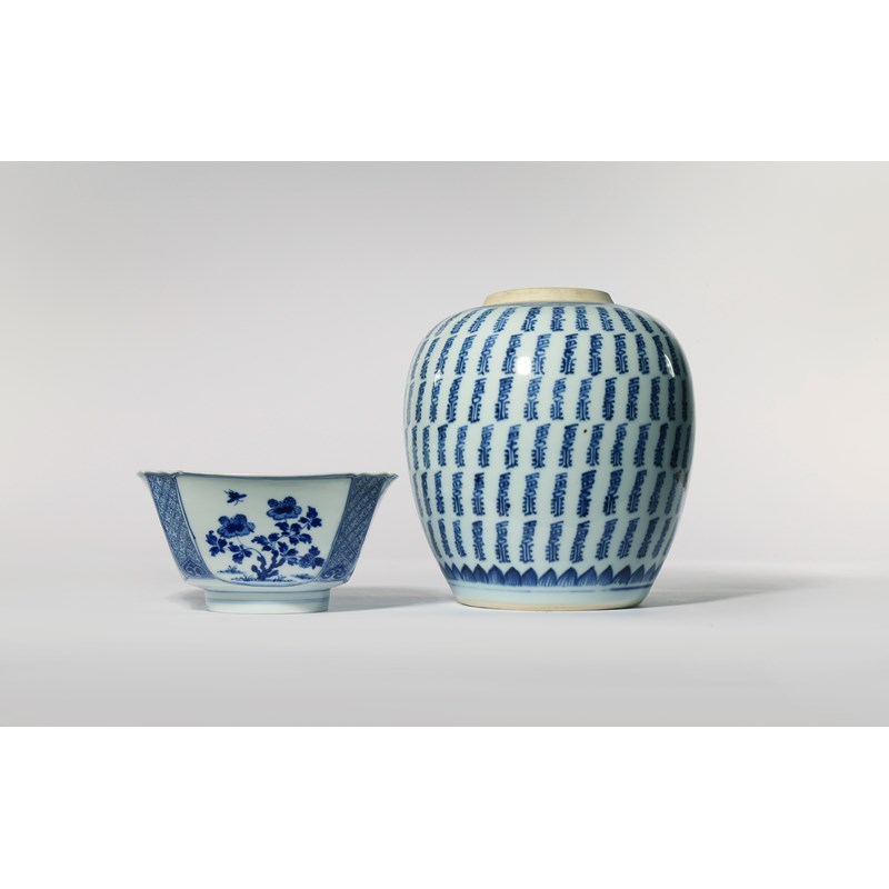 A CHINESE BLUE AND WHITE BOWL AND VASE KANGXI 1662-1722 The bowl with sprays of various flowers...