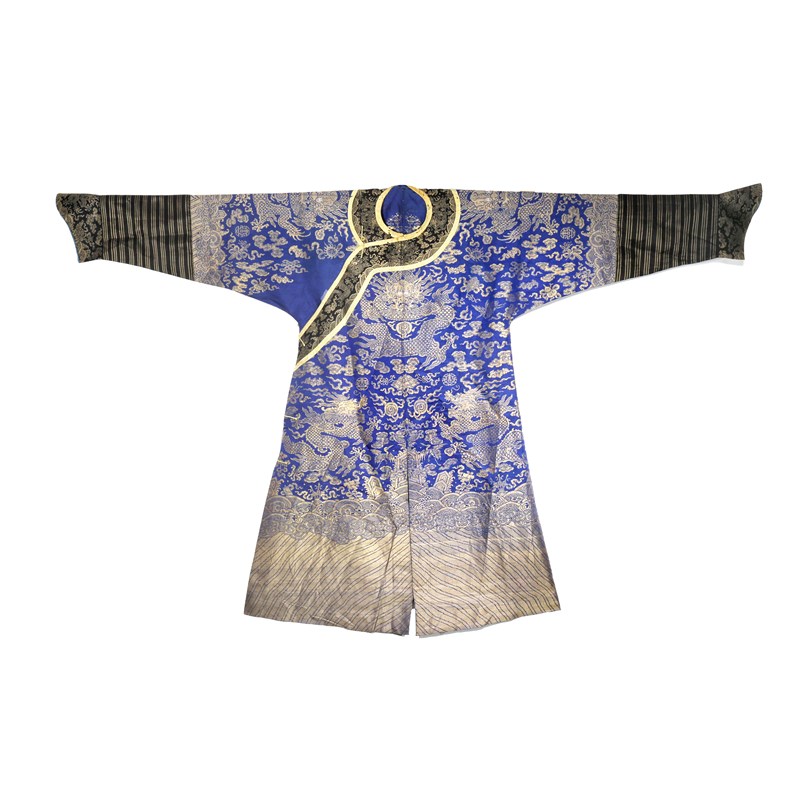 A CHINESE BLUE-GROUND EMBROIDERED SILK 'DRAGON' ROBE