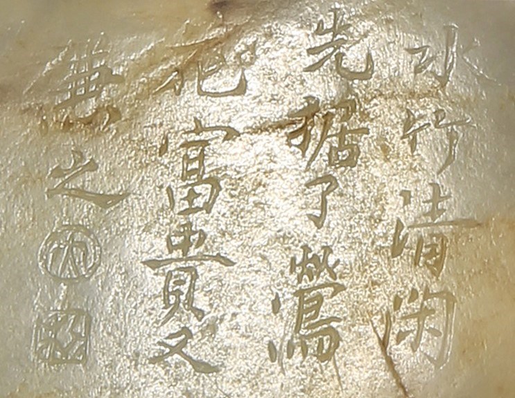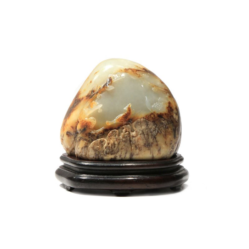 One side carved in low relief with birds perched on rockwork and flowering branches, the reverse finely incised with an inscription, the stone with large brown inclusions and striations, together with a wood stand, 6cm. (2)