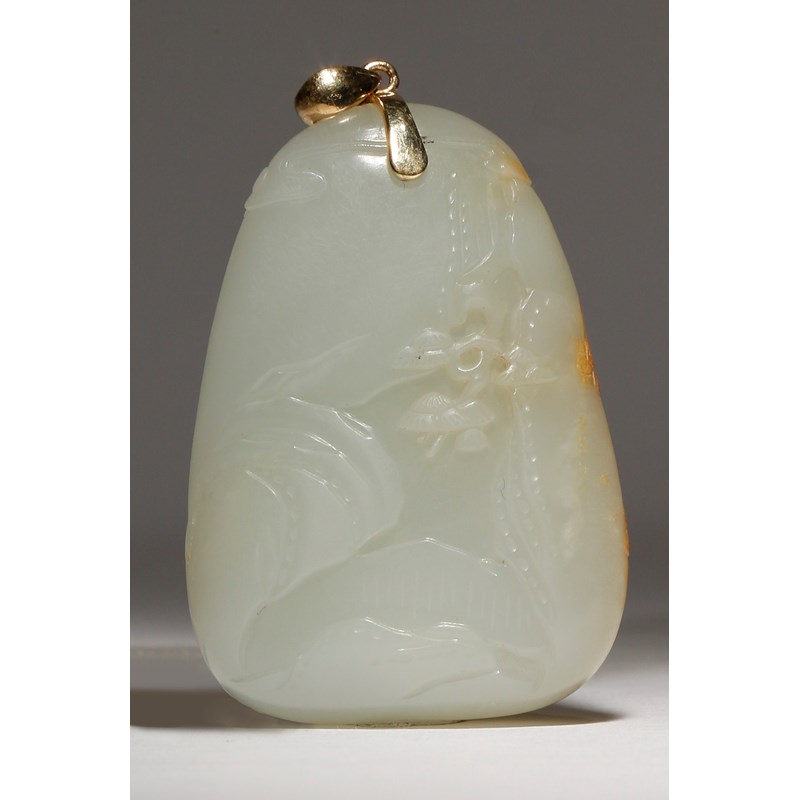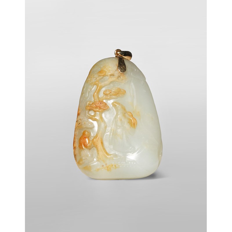 A CHINESE PALE CELADON JADE PENDANT PROBABLY LATE QING DYNASTY Carved with a scholar and his...