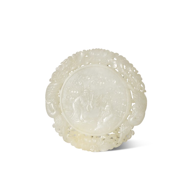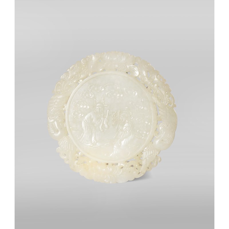 A CHINESE WHITE JADE CIRCULAR PLAQUE QING DYNASTY OR LATER One side carved with two figures...