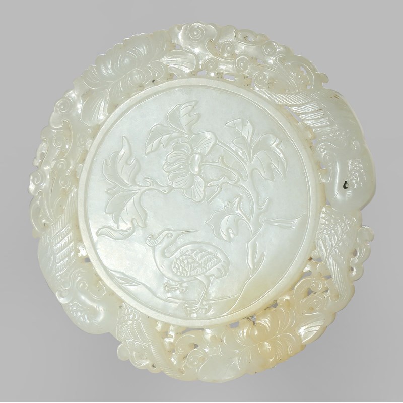 One side carved with two figures amidst cloud scrolls, the reverse with a crane beneath peony, the reticulated rim carved with phoenix, flowers and foliage, 7.5cm.
