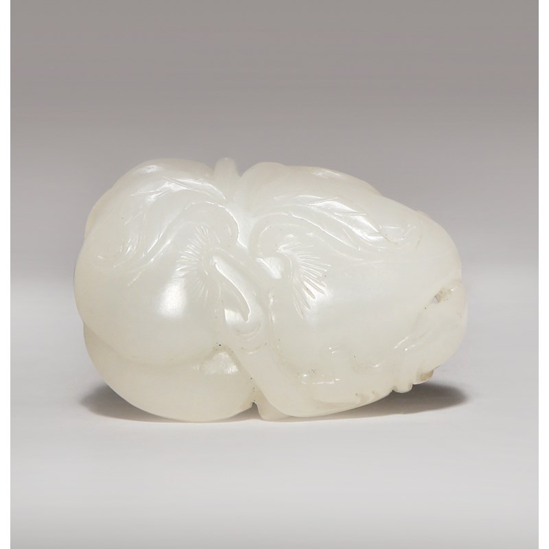 A CHINESE WHITE JADE 'PEACHES' PENDANT LATE QING DYNASTY Formed as four fruits issuing from leafy...