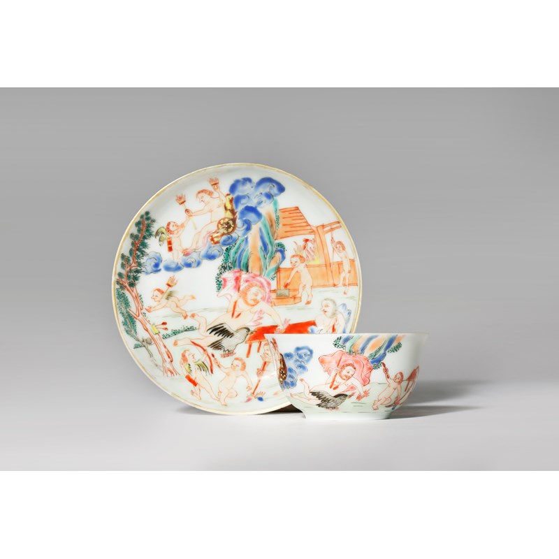 A RARE CHINESE FAMILLE ROSE MYTHOLOGICAL SUBJECT TEA BOWL AND SAUCER C.1740 Painted with an...